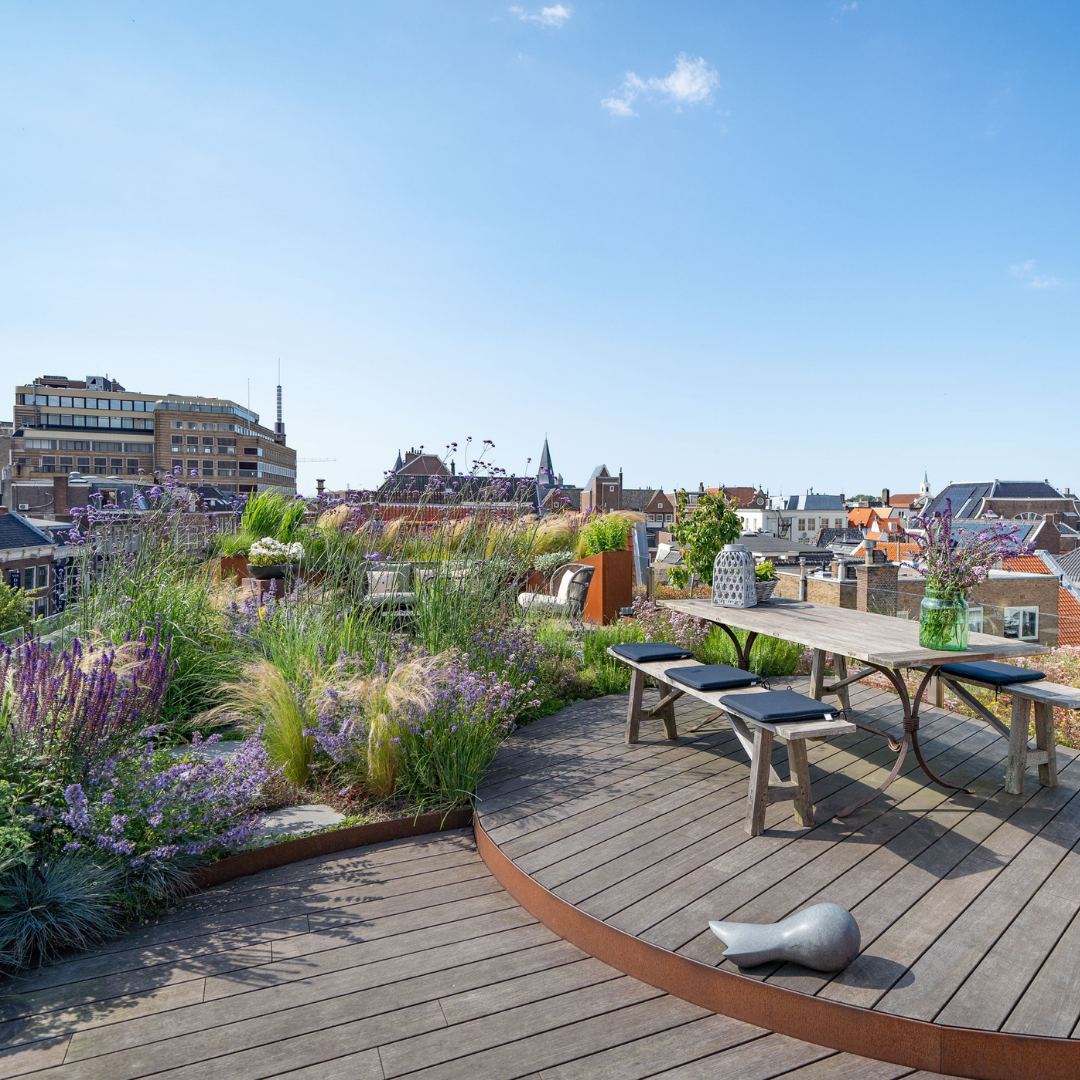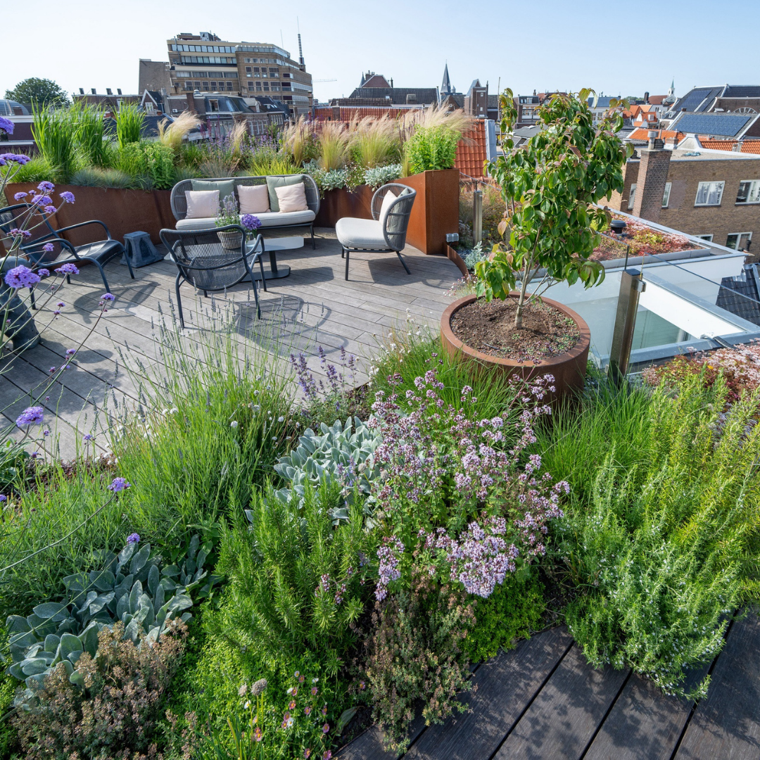 Op dit dak is een maatwerk cortenstalen plantenbak geplaatst die de ruimte een moderne, exclusieve uitstraling geeft. Door het slimme ontwerp is de daktuin niet alleen functioneel, maar ook een echte eyecatcher.